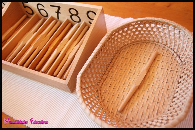 Con la caja de husos el niño aprende la secuencia de números del 0 al 9 y también nos enseña el grupo 0-9 como base de nuestro sistema decimal.