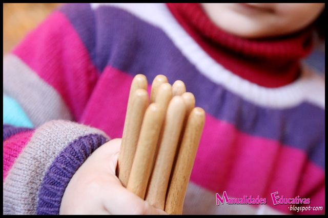 El niño va acumulando en su manita los husos correspondientes a cada número, así sienten como va aumentando el volumen, 9 husos casi no le caben en la manita!!